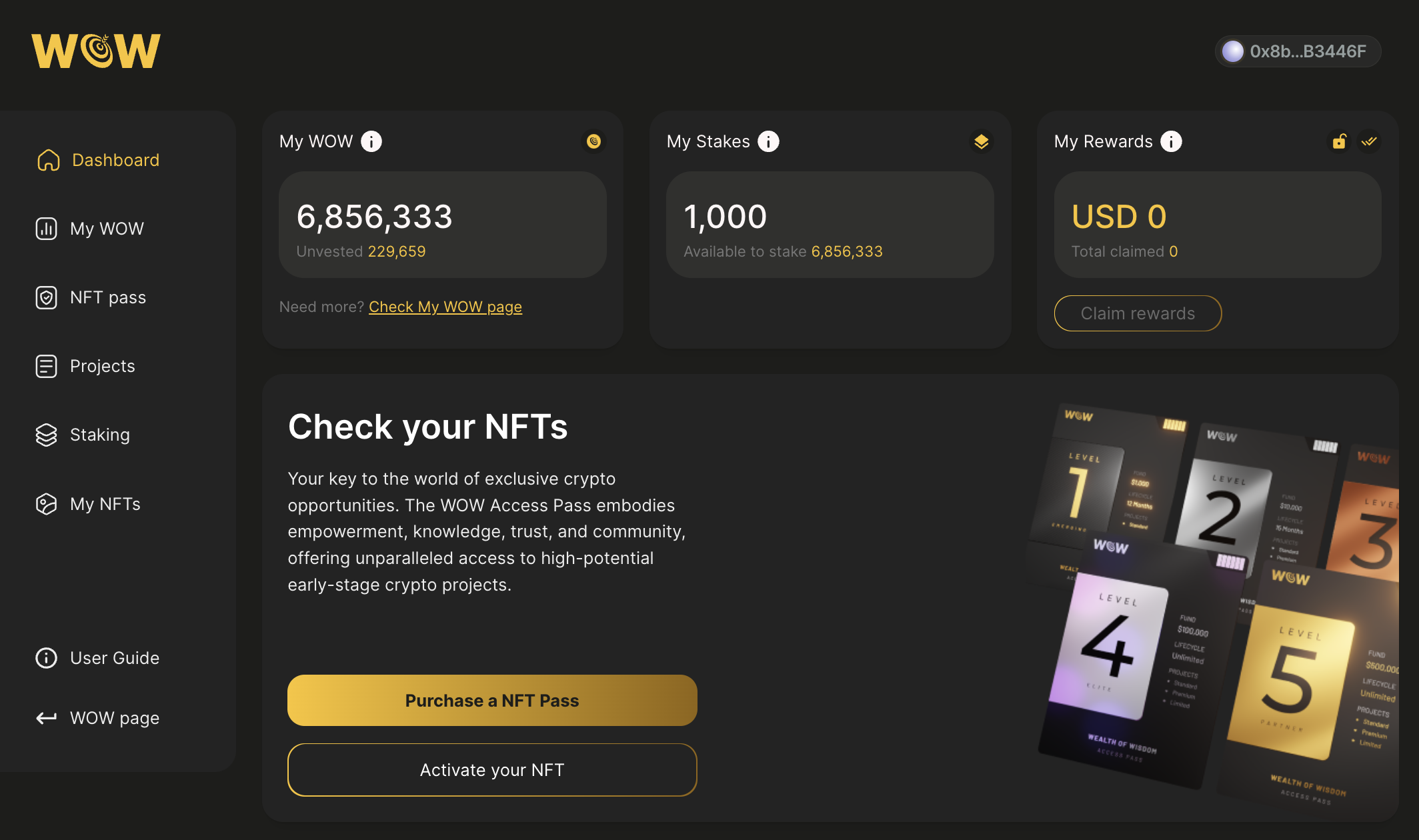 Navigate the WOW Dashbaord and see your WOW tokens, WOW stakes and rewards.