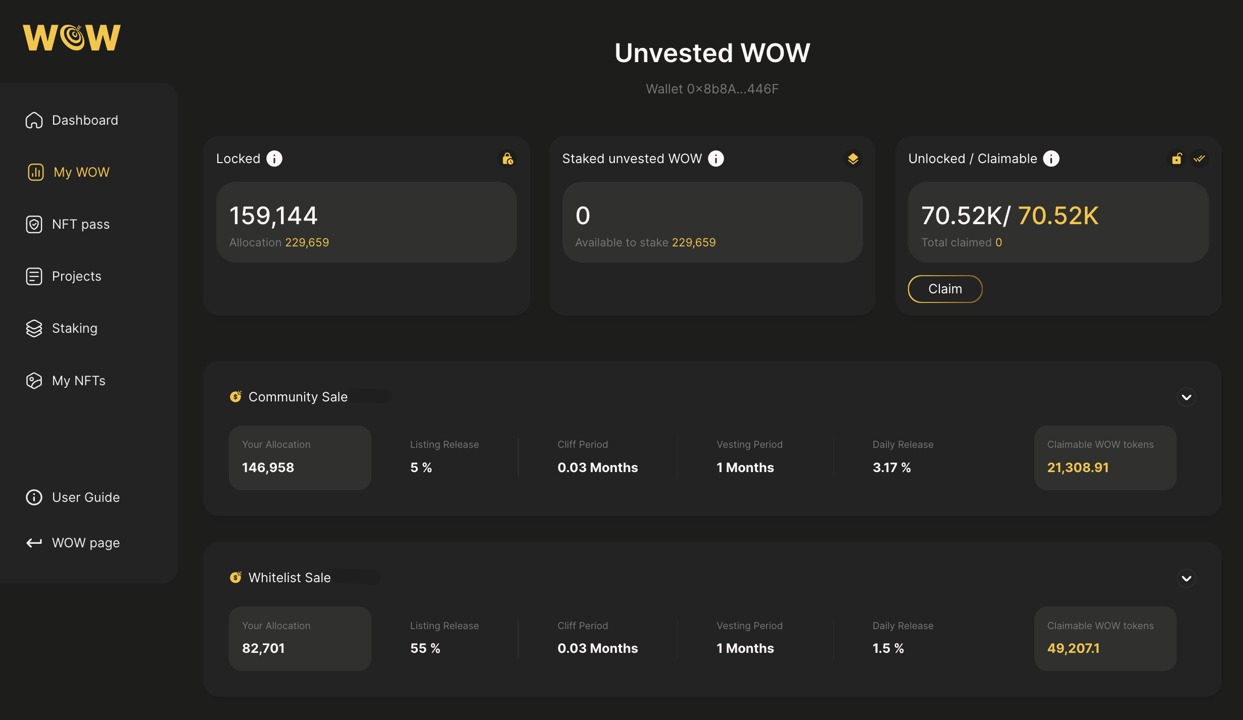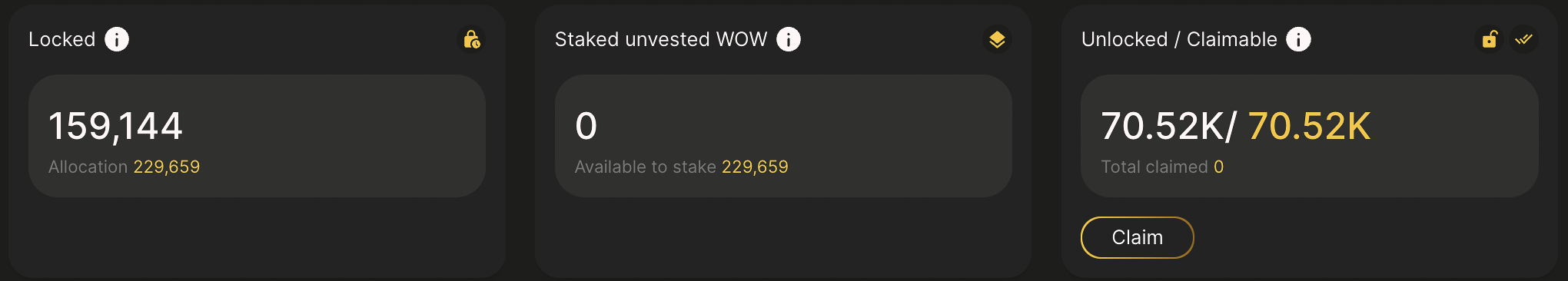 **Claimable:** Number of unlocked WOW which remain to be claimed. WOW must be claimed before staking.